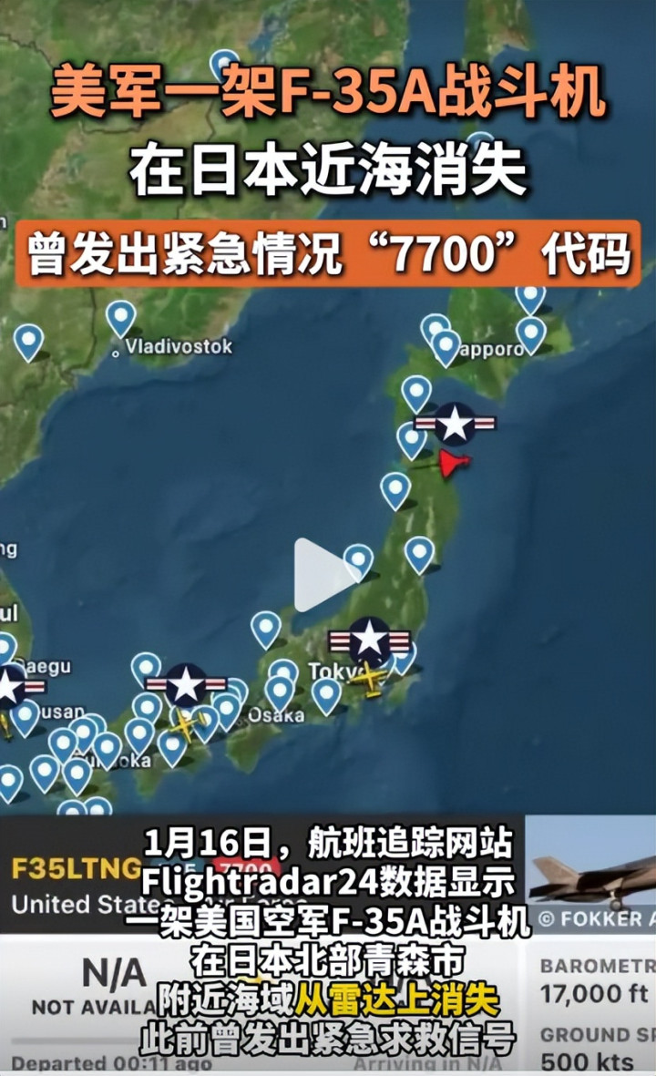 世界著名的开源航班追踪网站Flightradar24的监测数据,提供了2026年1月16日北京时间11时09,美国空军一架F-35A“闪电Ⅱ”战斗机,从日本海北部起飞,在青森市附近海域,发出国际通用紧急代码“7700”后,突然从雷达屏幕上消失,至今未知下落。